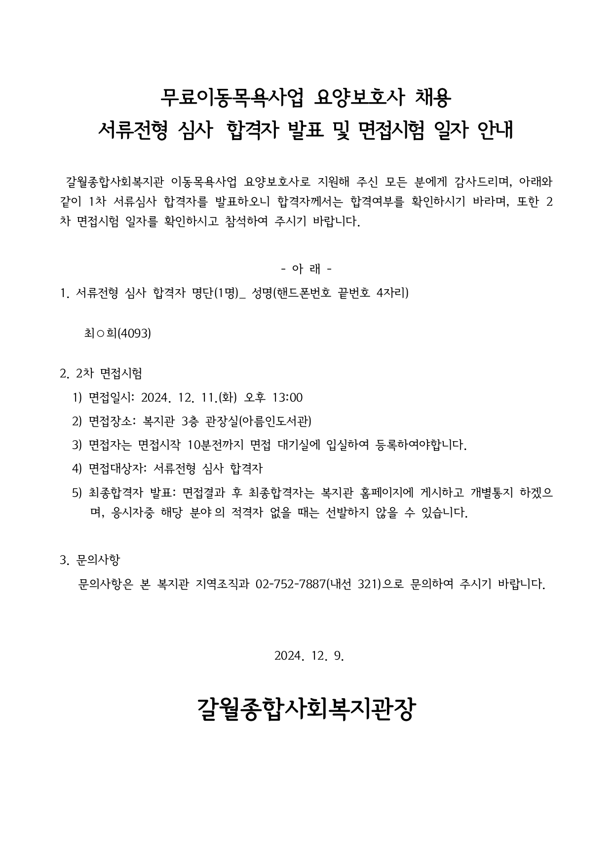 갈월종합사회복지관 이동목욕사업 요양보호사 서류전형 합격자 안내