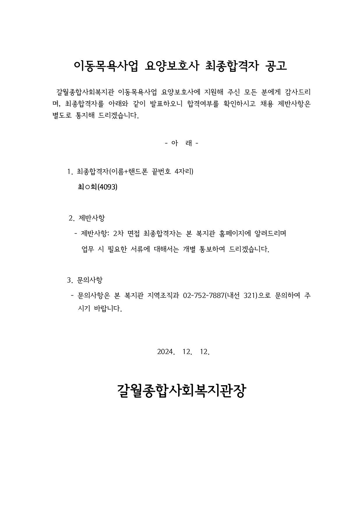 갈월종합사회복지관 이동목욕사업 요양보호사 최종 합격자 공고