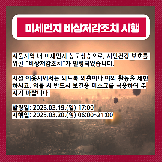 서울시 미세먼지 비상저감조치 시행[2023.03.20.(월) 06:00~18:00)]
