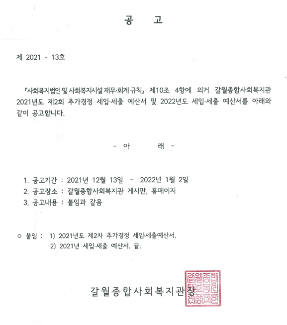2021년도 제2회 추가경정예산서 및 2022년도 예산서 관련 홈페이지 게시