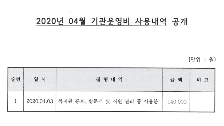 갈월종합사회복지관 2020년도 3,4월분 기관운영비 사용내역을 첨부와 같이 공개합니다.