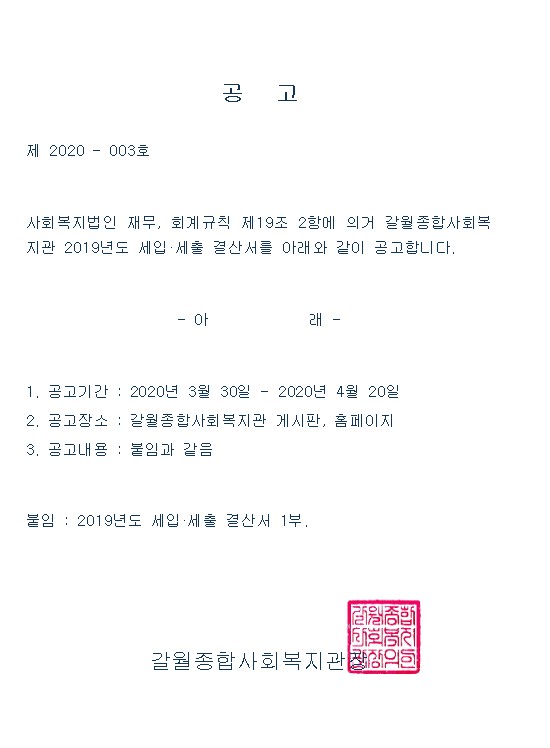 2019년도 결산서 공고