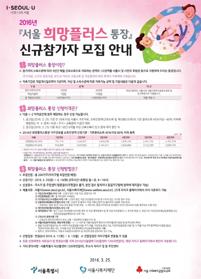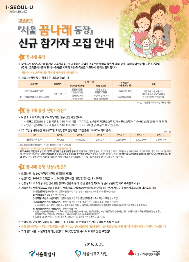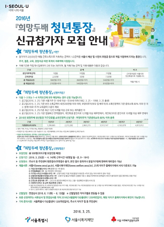 2016년 『희망두배 청년통장』 · 『희망플러스통장』 · 『꿈나래통장』 신규참가자 모집을 아래와 같이 공고하오니 많은 시민들의 관심과 참여를 부탁드립니다.
