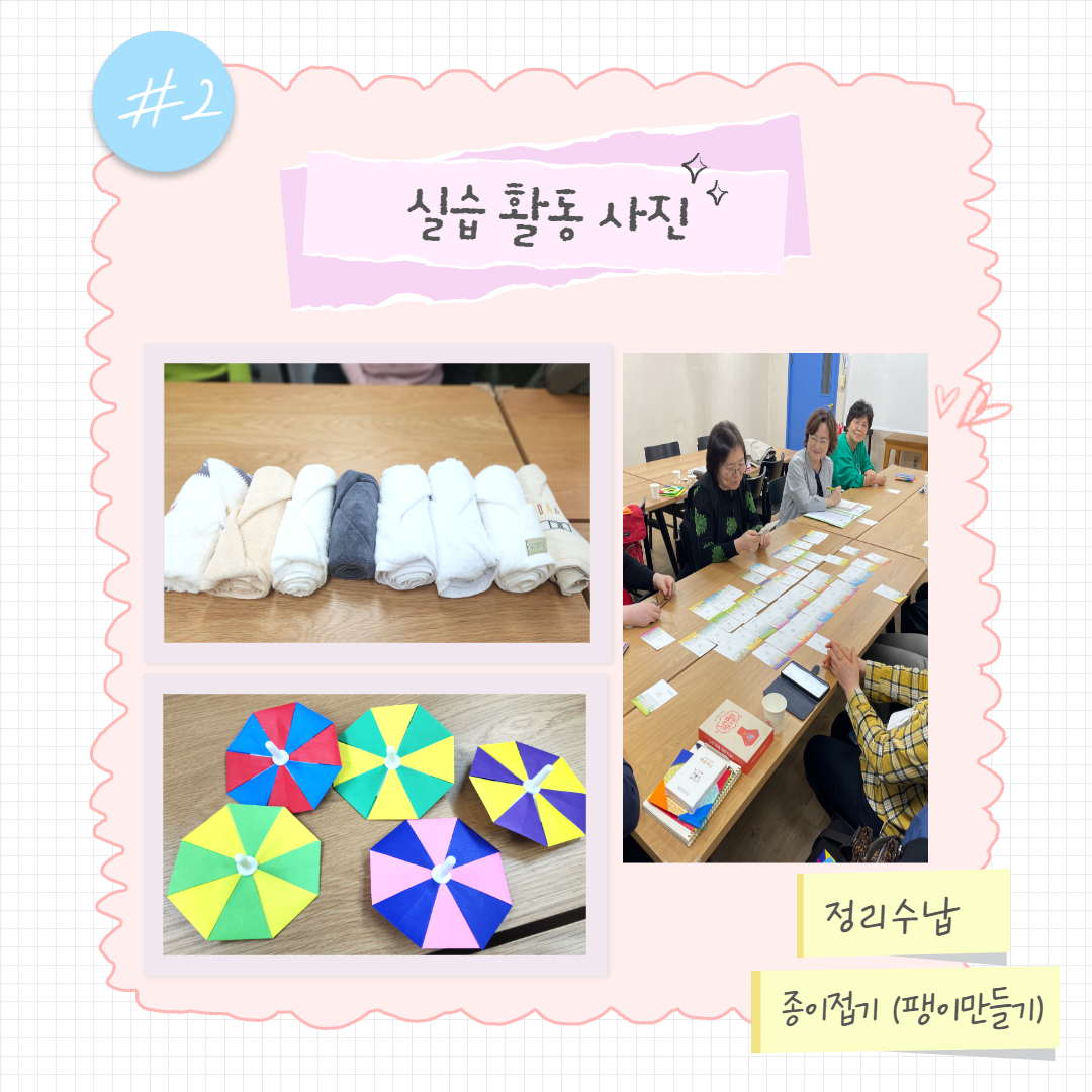 '해피시니어' 자조모임을 진행하고 있습니다. 서로 실버교육 내용을 공유하여 교육하고 실습하는 모임으로 자조모임에서 더 나아가 지역사회의 지역주민과도 소통하는 모임이 되기를 적극 지원하도록 하겠습니다. ^^