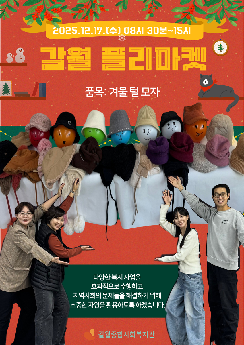 복지관 칭찬 이벤트, 갈월 플리마켓에 여러분을 초대합니다 !!일시: 2025.12.17.(수),08:30~15:00장소: 복지관 1층플리마켓 품목: 겨울 털 모자이벤트에 참여하시면 소중한 선물이 있습니다.많은 참여와 관심 부탁드립니다.❤️