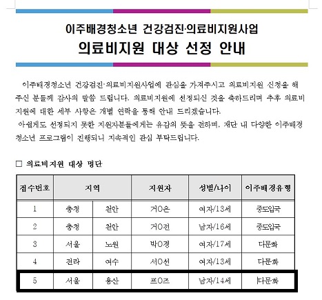 <사례관리과> 이주배경청소년지원재단 "건강 및 의료비 지원사업" 선정