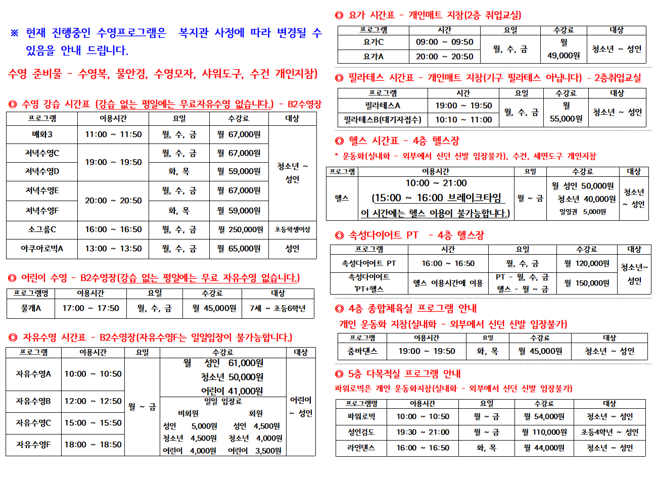 7월 수영/생활체육프로그램 안내