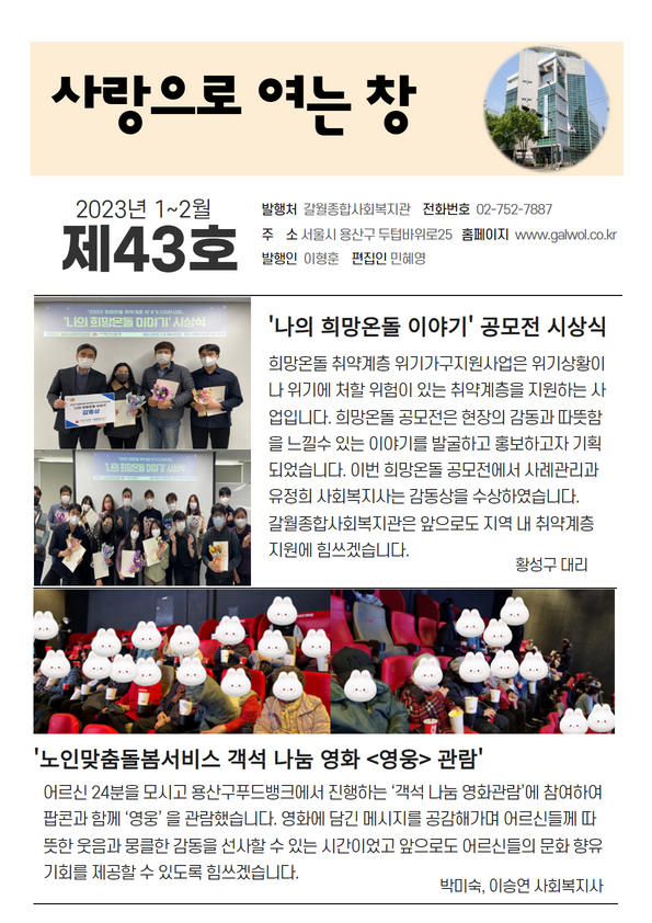 지역주민을 모시는 공동체로써 삶의질 향상에 최선을 다하겠습니다.